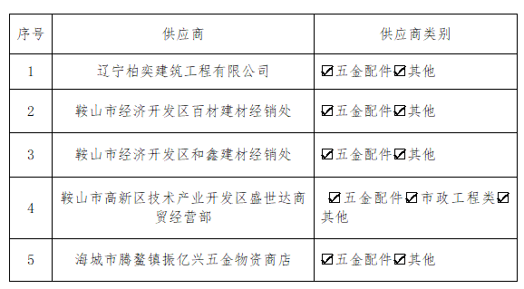 根據(jù)2024年5月11日發(fā)布的《供應(yīng)商入庫(kù)公告》要求,經(jīng)過(guò)報(bào)名篩選和資質(zhì)審查等程序,確定了5家供應(yīng)商符合入庫(kù)條件?,F(xiàn)公布經(jīng)過(guò)篩選的供應(yīng)商入庫(kù)清單,名單如下: